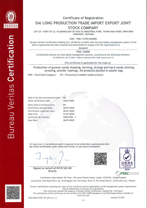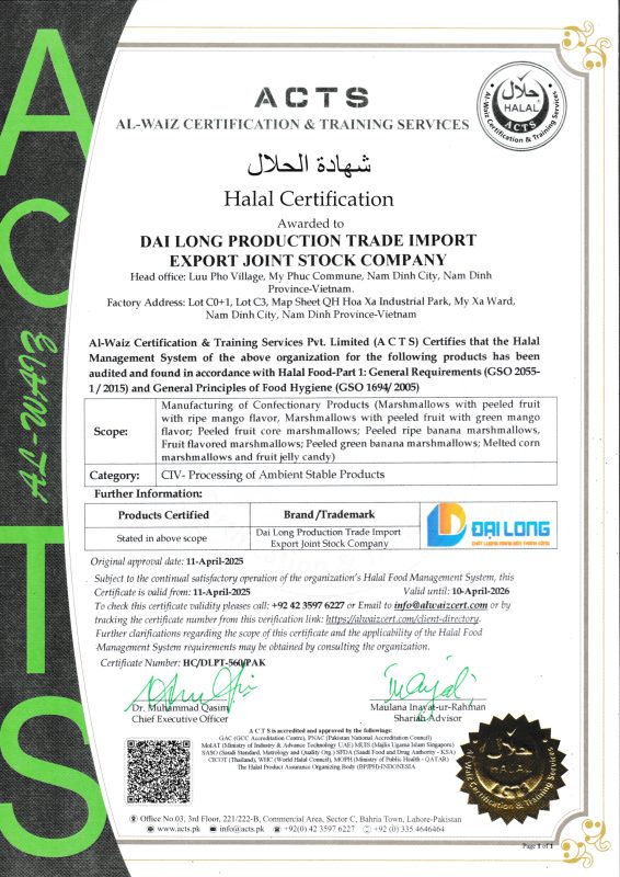 CÔNG TY CỔ PHẦN SẢN XUẤT VÀ THƯƠNG MẠI XNK ĐẠI LONG ( SẢN XUẤT BÁNH KẸO , THẠCH RAU