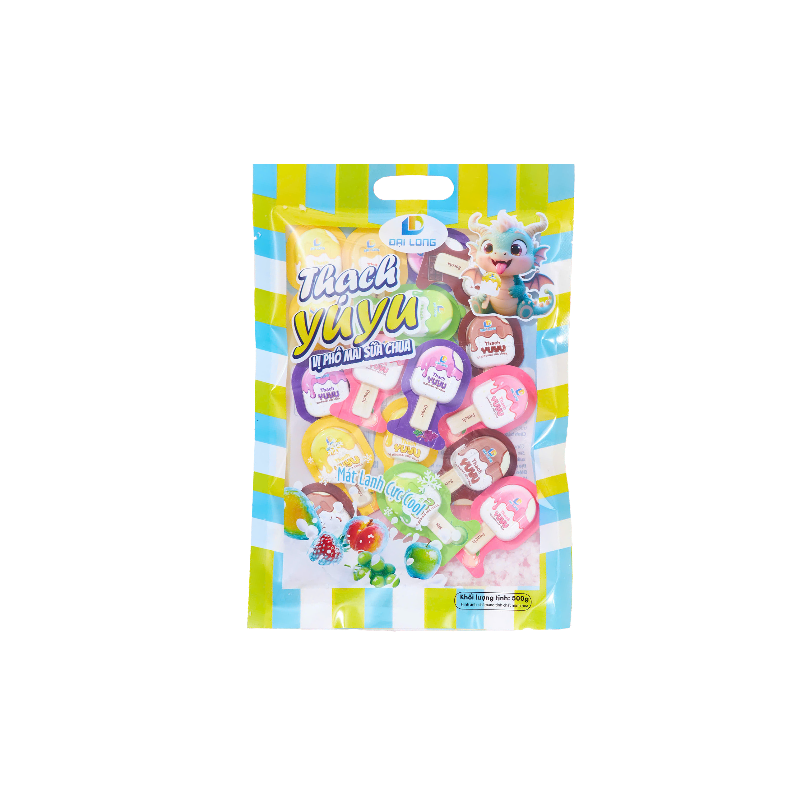 Thạch que kem YUYU được sản xuất tại Việt Nam. Sản phẩm triết xuất nước trái cây và sử dụng màu tự nhiên từ rau, củ, quả phù hợp cho trẻ nhỏ và người lớn. Thạch núng nính hình que kem, ăn vào có vị béo ngậy và dư vị mát mát giống như cây kem tươi.
